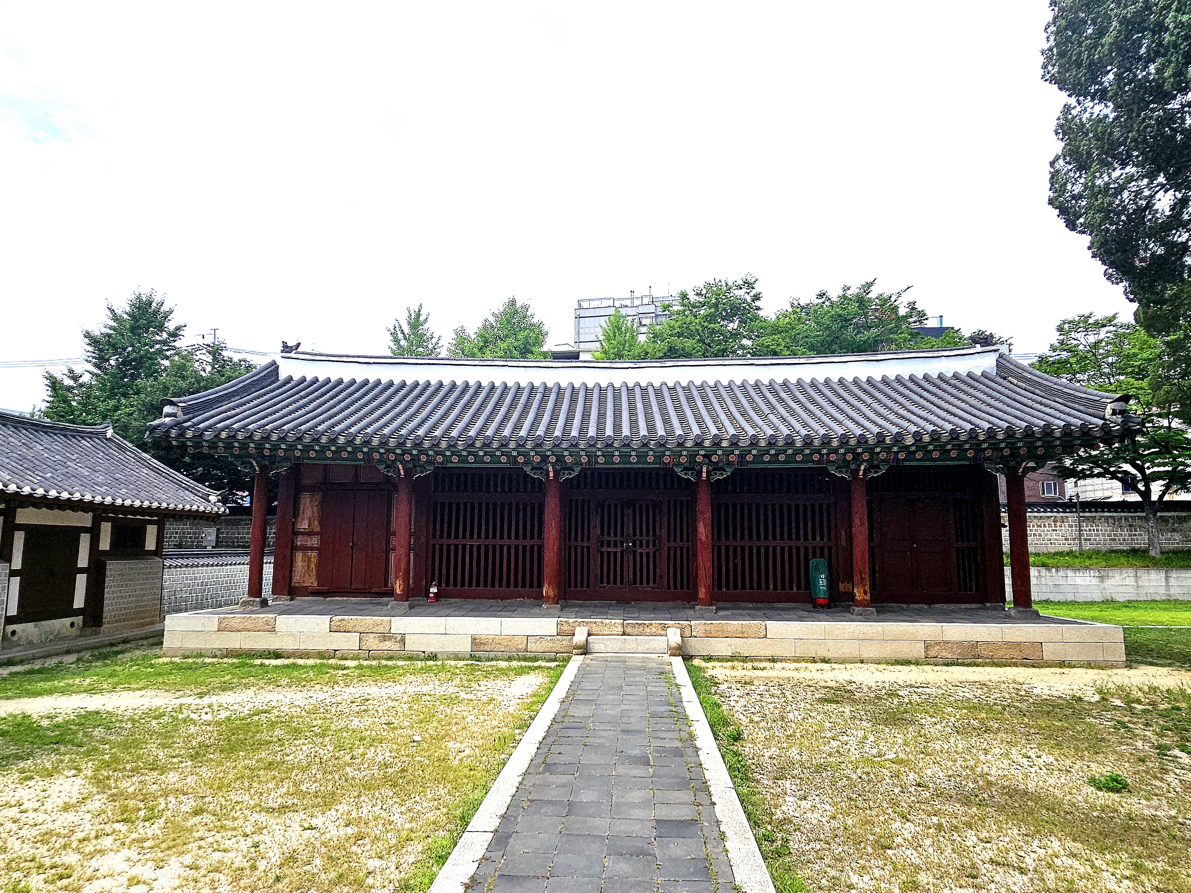 서울 동관왕묘의 정문. 정면 5칸 측면 2칸의 겹처마 맞배지붕 건물이면서 가운데 3칸의 지붕이