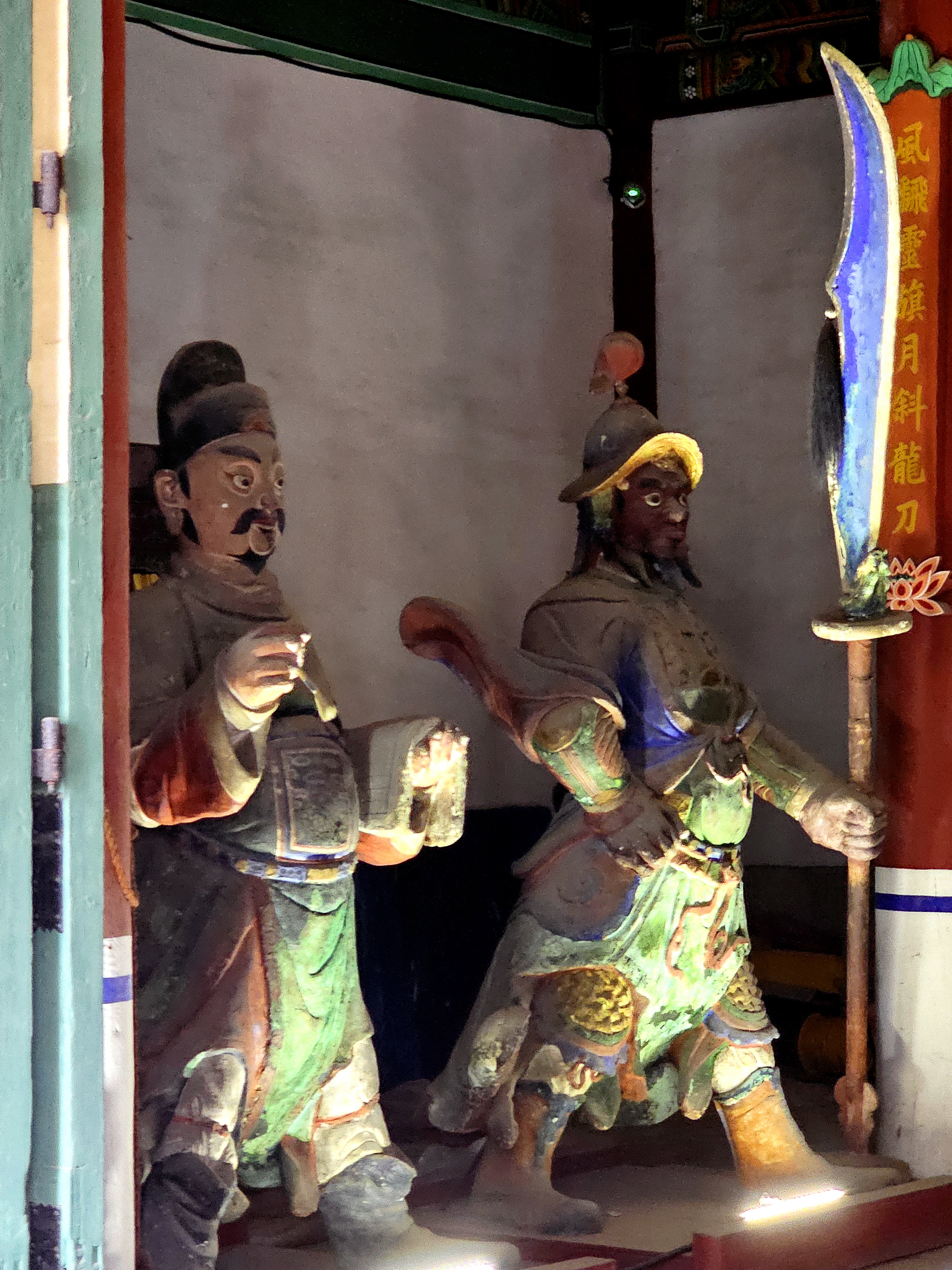 관우상은 정전 중앙에 있으며 앞쪽 좌우로는 형주에서 관우를 모신 관평, 조루, 주창, 왕보가 관우상을 호위하듯이 서 있습니다.